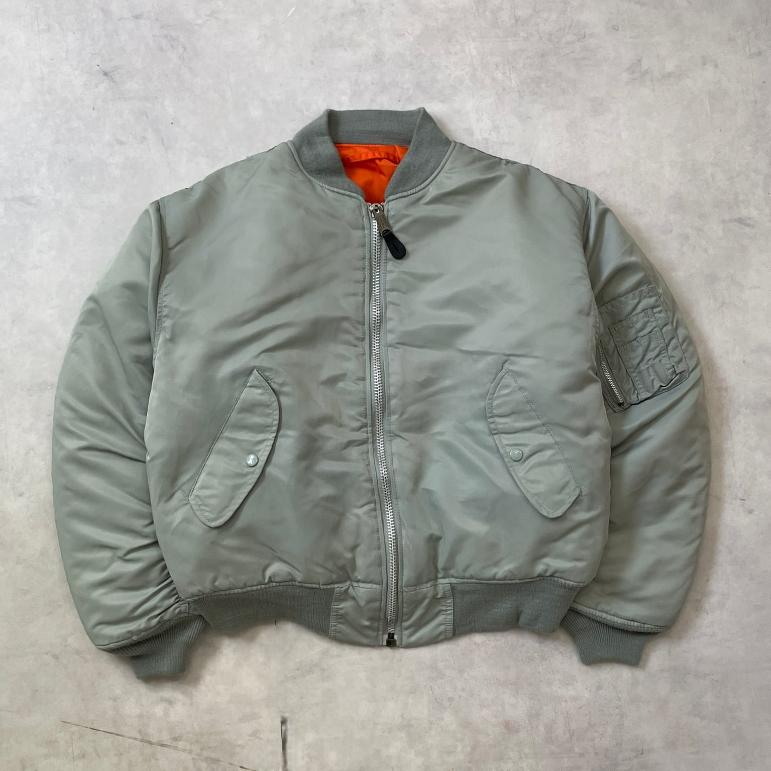 色が珍しいタイプのMa-1です。シルバーとグリーンの中間の様な色味です